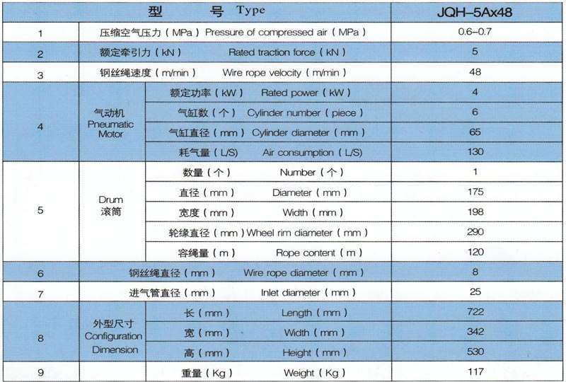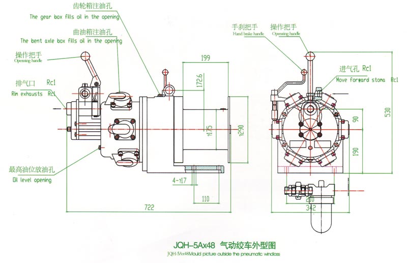 JQH-5Ax48气动绞车,采用压缩空气为动力,推动TMH4A活塞式气动马达工作。再通过二级齿轮减速,把扭矩传给滚筒。气动绞 车的操纵.是靠马达体上的手操纵转向阀实现正转、反转、停止等项动作。为保证气动绞车的安全性,该气动绞车还具有手刹车功能。特 别适合于矿山、建筑工程以及海上、陆地油田钻井二层平台上之用。